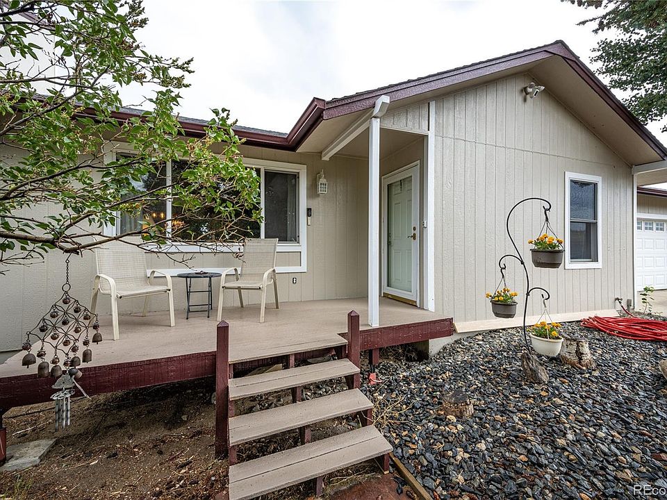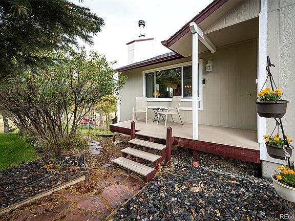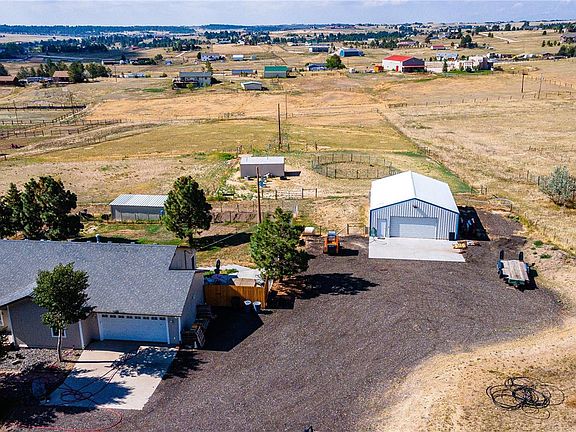Approximately 0.2 miles of dirt roads before you enter this 5-acre property through your own electric gate to a recycled asphalt driveway. The yard has matured trees, landscaping, sprinklers in both front and back yards, barn/tack room, round pen, electric watering tank and fenced pasture areas. The insulated 40x30 shop has concrete flooring, water, propane, electricity and built-in shelving. Like entertaining family and friends? There is a patio on the south side of the home that is plumbed for your gas grill, enjoy your views from the hot tub on the west side and don't forget the newly painted deck just outside the dining area. New exterior and interior painting. Carpets have been cleaned. Step inside to new luxury vinyl plank flooring that flows down the hallway and into the kitchen and dining area. The kitchen has lots of counter space, newly stained cabinets and stainless-steel appliances. The living room fireplace is plumbed so you can use propane or wood on those cooler fall and winter days and nights. Enjoy A/C on those warmer summer days. The primary suite includes a water closet, double sink with large mirror, walk-in closet and the bedroom. The walk-out basement is set up as a Mother-in-law suite, including a non-conforming bedroom, family room, kitchen with an island, 3/4 bathroom, and an unfinished laundry/storage room with egress windows. Although there is forced air heating, the basement also includes a pellet stove. There are also 2 40-gallon hot water heaters. Take in the view of Pikes Peak, enjoy growing your own garden or ride your horse on the bridle path.