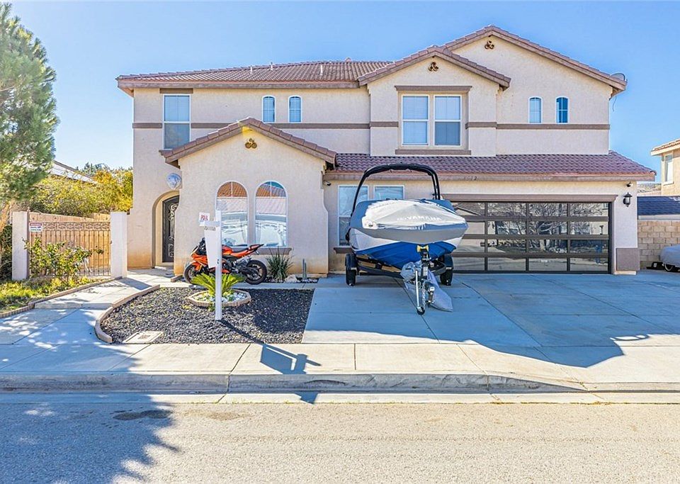 Nearby trendy shops is a remarkable home in Palmdale of 3,476-SqFt, 5 bed, 3 bath, & a large backyard, creating an incredible escape. An inviting double door entrance reveals the grand formal dining room featuring high ceilings, recessed lighting, crown moldings, and an artistic descending chandelier. Gorgeous stone floors stretch throughout the first floor. An immaculate kitchen complete with glossy counters, built-in appliances, and plenty of storage connects a complimenting living room with a fireplace and surround sound system. There's even a laundry room just off the kitchen! The bedrooms inhabit the second floor where walk-in closets and glittering bathrooms are standard. The double door entry to the master suite includes a tiled bathroom with double vanity sinks, deep soak tub, walk-in shower, and closet with mirrored sliding doors. A backyard oasis offers a rustic awning over the patio areas, outdoor barbecue kitchen, glittering in-ground pool with safety fence, and separate gazebo. As a bonus, the garage has been converted into an extended family room/dining area, completed with a/c wall unit, plenty of storage and kitchenette with built-in features.