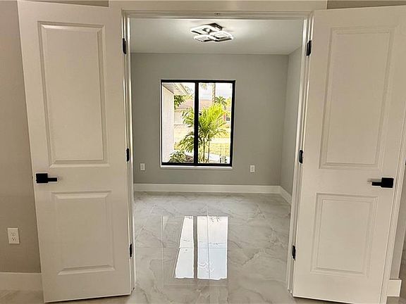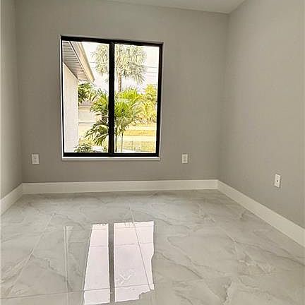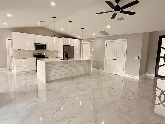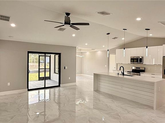 NEW CONSTRUCTION. This three-bedroom plus den, two-bathroom home features tile floors and modern kitchen cabinets. Kitchen's island with Waterfall quartz countertops and stainless-steel kitchen appliances. Master suite with two walk-in closets, bathroom with dual sinks and modern floating cabinets, quartz countertops, glass shower enclosure, and separate toilet. The Guest bathroom also has a glass shower door, modern floating cabinets, and a stainless-steel shower tower panel system with massage body jets. Spacious backyard with room for a pool. The laundry is conveniently located inside the house and includes a laundry sink with a quartz countertop, offering extra space to fold the clothes. Two-car garage and concrete driveway. The house is in a quiet neighborhood close to Lee Blvd, Walmart, other shopping centers, and the local hospital. It is also close to Sunshine Blvd and gives quick access to SR-82, Daniel's parkway, and I-75.