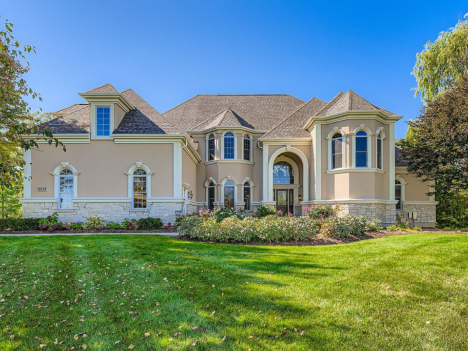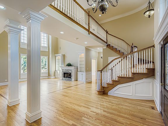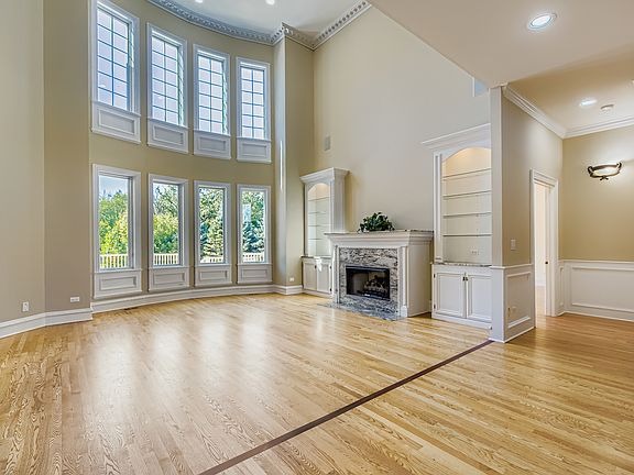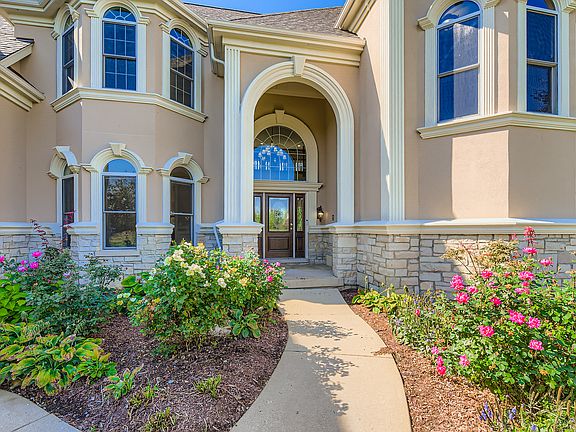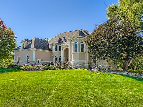 *** Welcome to The Peak of Elegance *** An Extraordinary Estate that artfully combines sophistication, comfort and grand-scale living. This stunning residence offers 6,200 SF of redefined living space with an additional 3,200 SF walk-out lower level designed for entertaining and multi-generational living. Step through the grand entrance to soaring ceilings and an open-concept layout that immediately conveys grandeur. Volume ceilings throughout the home (10-foot ceilings on main level) are complemented by a variety of ceiling styles, heights and distinctive crown molding that elegantly define almost every room. The formal living room impresses with two-story windows that frame serene views of the manicured grounds and flood the room with natural light, while the impressive family room is a true show-stopper with a two-story cathedral ceiling detailed by arched trusses and boxed beams. The chef-inspired gourmet kitchen is equipped with top-of-the-line Thermadore appliances, custom cabinetry, and premium finishes perfect for casual breakfasts or large-scale entertaining, with a separate formal dining room for elegant dinners and special occasions. A rare and desirable feature is the presence of two luxurious primary suites, one on the first floor for ultimate convenience and one on the second floor for added flexibility. The additional bedrooms are generously proportioned with private baths and abundant closet space for family or guests. An enormous 23' x 27' loft provides endless options as a media lounge, recreational/game or fitness area. The elegant style of the home extends to the secluded office/library adorned with detailed millwork, situated on its own landing. Rich hardwood floors span the first and second levels (most newly installed in 2021). A pair of gracefully designed staircases, one grand and formal, the other secondary and functional, enhance the home's flow and architectural distinction. Three inviting fireplaces warm the living room, family room and the second family room in the finished lower level. The finished walk-out lower level continues the home's refined design with a second kitchen with Thermadore appliances, a fifth bedroom, a full bath with sauna, a family room with a fireplace and a recreation room leading out to the resort-style pool and hardscape patio for seamless indoor/outdoor entertaining. Practical luxury continues with a 4-car garage outfitted with a 4-post Eagle Lift system, accommodating a fifth car. Significant improvements in 2025 include a new roof, gutters, and soffits, as well as a freshly painted interior. This remarkable estate is a statement of redefined living, beautiful views, exceptional craftsmanship and timeless design. *** Live in the Peak of Elegance and Elevate Your Lifestyle ***