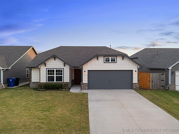 Beautiful 3-bedroom, 2-bath home built in 2020 with a modern split floorplan. Step into a bright, open-concept living, dining, and kitchen area featuring vaulted ceilings, large windows, and wood-look tile flooring. The kitchen boasts shaker-style cabinetry, quartz countertops, a pantry closet, under-cabinet lighting, and an island with a breakfast bar. The primary suite includes a large walkthrough closet that connects to the laundry room, and an ensuite with a soaking tub and separate shower. Enjoy outdoor living on the open patio overlooking a fully fenced backyard. Conveniently located with just a short drive to highway access and Broken Arrow Hills shopping. Don’t miss out on this one, schedule your showing today!