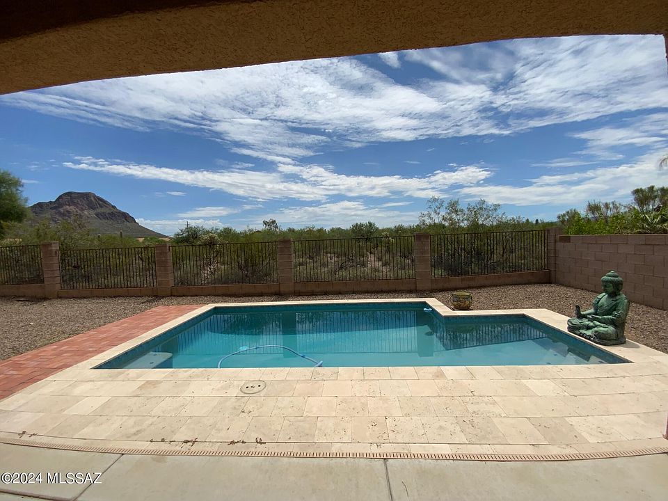 Tucson Mountain Sanctuary - Pool, fully owned Solar, backs to open space. Beautifully remodeled kitchen with plenty of custom cabinets, granite countertops, and upgraded stainless steel appliances. Newer refrigerator and hot water heater. Custom window art and 3 barstools convey. All tile flooring. Split 4-bedroom floorplan. Washer & Dryer included. Water softener system. Low care landscaping. HOA only $15/mo!