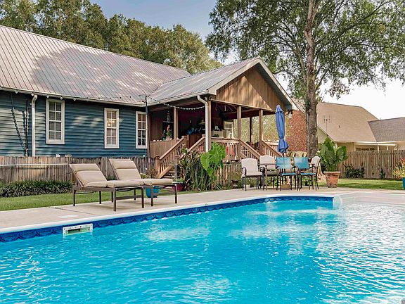 This adorable farmhouse is full of curb appeal and Southern charm, set on a spacious 1-acre lot. Inside you’ll find warm wood floors, a cozy wood-burning fireplace, a large kitchen, and a formal dining room, perfect for entertaining. The primary suite is conveniently located downstairs and features a large sitting area plus an ensuite bath with double vanities, a clawfoot tub, and a separate shower. The main level also offers a second bedroom and office, while upstairs you’ll find two additional bedrooms and a bonus room for flexible living space. All the rooms upstairs are large and versatile and one could be used as a second master. Step outside to enjoy a large covered patio overlooking the inground saltwater pool, ideal for summer fun and relaxation. The backyard is fully fenced for privacy and includes a 15x23 storage building/workshop, a garden area, and fruit trees (orange and fig). This home has not flooded and does not currently require flood insurance. Currently located in Live Oak School District. Make your appointment today!