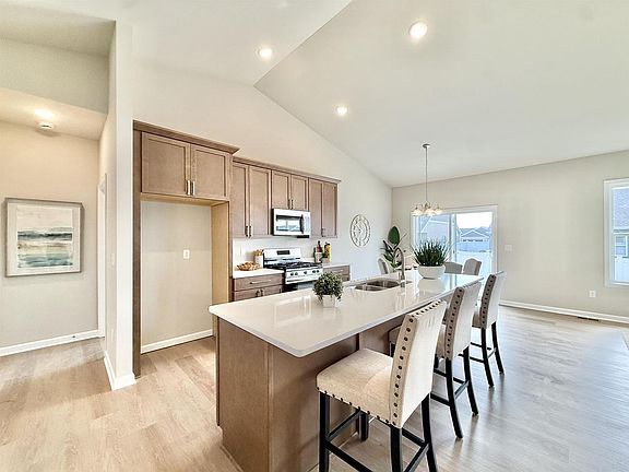 Brand new and built to impress! This 3-bedroom, 2-bath split bedroom ranch checks all the boxes. Step inside to soaring vaulted ceilings and an open-concept layout designed for modern living. The eat-in kitchen is a showstopper, featuring a breakfast bar island, walk-in pantry, and plenty of space to gather. The oversized 3-car garage leads directly into a smartly designed drop zone and laundry area, keeping daily life neat and organized. The primary suite offers a spacious walk-in closet and double sinks for added convenience. With quality craftsmanship throughout and thoughtful design in every corner, this home blends function and style for easy living.