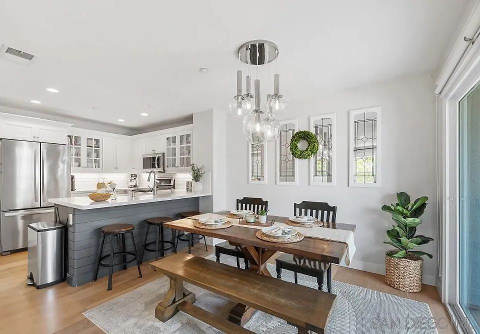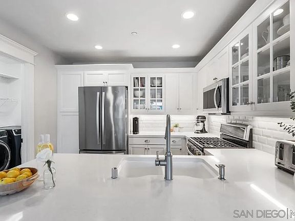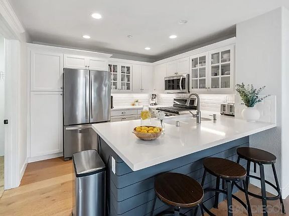 Welcome to 3514 Shoreline Bluff Ln, a beautifully upgraded, light-filled corner townhome in the highly desirable At The Bay community in Point Loma. This 2-bedroom, 2.5-bath home has been thoughtfully renovated throughout with engineered hardwood floors, quartz countertops, updated cabinetry, custom window treatments, and woodwork details including board and batten in the entry and shiplap in the half bath. The formal entry features two closets for added storage, while the spacious primary suite offers a walk-in closet and en-suite bath. A full-size laundry room with a newer washer, dryer, and built-in storage is conveniently tucked away from the main living space. The attached 2-car tandem garage provides direct access and additional storage. This move-in ready home is part of one of the newer communities in the area and offers some of the lowest HOA dues around. VA approved. Enjoy peaceful views of the pool, clubhouse, and playground from this prime end-unit location. Situated in the heart of coastal San Diego, you're just minutes from Liberty Station, Shelter Island, Mission Bay, SeaWorld, Downtown, and the waterfront.