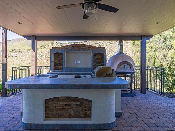 Located in Oakridge Ranches, minutes from Temecula Wine Country this 20+ acre property is reminiscent of an Italian Villa with breathtaking views of the mountains, city lights, hot air balloons and sunsets over the Santa Rosa plateau. The home features OWNED SOLAR with BATTERIES AND BACK-UP GENERATOR a PRIVATE WELL (no water bill) and septic system for those wanting to live an “off-grid” lifestyle. If off-grid living is not your thing, you’ll be pleased to know the system is tied in to the local utility grid. The home features 3 bedrooms plus a loft, 3 remodeled bathrooms a beautifully appointed kitchen with generous amounts of custom cabinetry, granite countertops and Thermador appliances. The spacious island is perfect for informal meals while the separate dining room provides an opportunity for more formal gatherings. The living room seamlessly transitions to the outdoors and includes an expansive patio, OUTDOOR KITCHEN, complete with custom PIZZA OVEN from Napa, sparkling pool and jacuzzi amidst the backdrop of picturesque views. If that were not enough, outside you’ll also find an extensive variety of fruiting trees – grapefruit, lime, kumquat, marcona almond, Kalamata olive, just to name a few. There’s also an enclosed garden, chicken coop, greenhouse and outdoor metal building with roll-up door. Upstairs, the primary bedroom is a retreat unto itself with a large bedroom and sitting area, quaint balcony with views of the mountainside, walk-in closet and large en suite bathroom with dual sinks, spacious shower and charming claw foot tub.