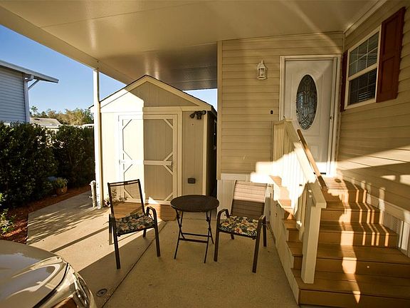 This fabulous, fully-insurable, almost new 2018 park model sits on the canal at American Condominium Parks Zephyrhills! Only 1 owner! Sit back and enjoy the water view from your living room bay windows. Or step out on the piazza by the water to watch the wildlife in and around your seawall. Enjoy dining in the beautifully appointed dining area. Beautiful wood cabinets in this home! The all electric kitchen is sparkling, modern and efficient. The bedroom has a large built-in closet. This house is full of light; and the double-pane, energy-efficient windows hinge inside for easy cleaning! This home is well insulated and the electric bill reflects that. There is a shed for storage in the 15' x 30' covered car port. There is even extra storage beneath the 3 porch stoops! The relaxing views, gorgeous wooden cabinets, luxury vinyl flooring and plenty of storage make this almost brand new home a must-see! Call for an appointment. American Condominium Parks Zephyrhills is a 55+, gated community with heated pool, clubhouse, exercise room, sauna, hot tub, tennis/pickleball courts, horse shoe pits, shuffleboard, and many more amenities. A friendly active community with dances, dinners, and fun entertainment. Perfect for full time, affordable living; and cost effective for snow birds. No rent as YOU OWN THE LAND. There is a reasonable monthly fee that maintains the common elements and amenities for your use.