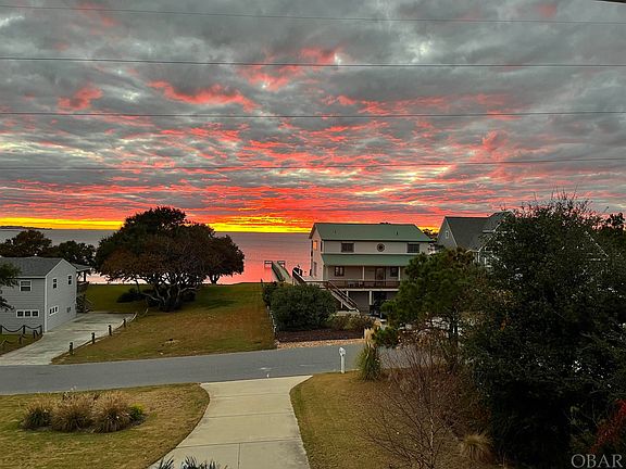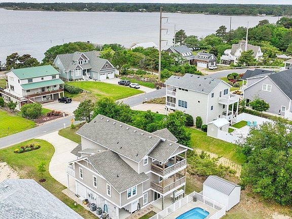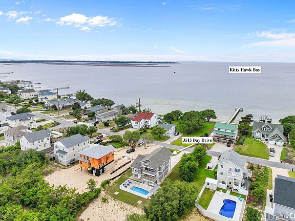 Coastal living in this "like new" home in Kitty Hawk, NC awaits you! Situated on a large 20,000+ sq. ft. lot , Boasting sound views and stunning sunsets! This never rented, custom built home by esteemed builder Olin Finch, features an elevator, 12x24 private pool and an additional recreation room. At almost 3000 square feet, this home offers expansive stairways, lovely five panel doors, plantation shutters, luxury vinyl tile and tons of natural light. Main level; two garages, recreation room with wet bar, half bath, access to pool area, outside shower and ice maker. Mid Level; Primary bedroom with walk in closet and ensuite bath. Large custom tile, glass enclosed shower, water closet and double vanity with comfort height cabinets. Hallway access to the laundry room with a utility sink. The full hall bath with tub/shower is shared by two bedrooms. Each bedroom has a walk-in closet and private deck. Landing; half bath. Top Level; Stairs to the loft, perfect for an office with a water view or reading nook. Generous entertaining great room with access to the covered deck facing the sound and the screened porch on the rear for taking in the abundant Outer Banks wildlife. Gas fireplace, built in cabinets and wired flat screen tv. The sophisticated kitchen has a Culligan water filtration system. Gorgeous Quartz countertops, stainless appliances, five burner gas cooktop with hood vent, wall oven and wall microwave.. A large walk-in pantry provides ample storage, a beautiful center island for family and friends to gather around, and soft close drawers. Indoor and outdoor living has been thoughtfully planned and maintained. The exterior siding is LP smart siding. Yard irrigation with private well maintained by Grounds Pros keeps the lawn in top shape. Large exterior 14x10 storage shed for workshop, studio or toys. Walk or bike the Bay Drive path that can take you all the way to the Wright Memorial, schools, sound access and any one of the numerous parks, playgrounds and trails the town offers. There are tons of great restaurants and entertainment as well. Enjoy sound access and a public boat launch just minutes away. Kitty Hawk offers numerous ocean accesses and parking lots. Ring home security system and all appliances convey with the property. Virtual Tour Available.