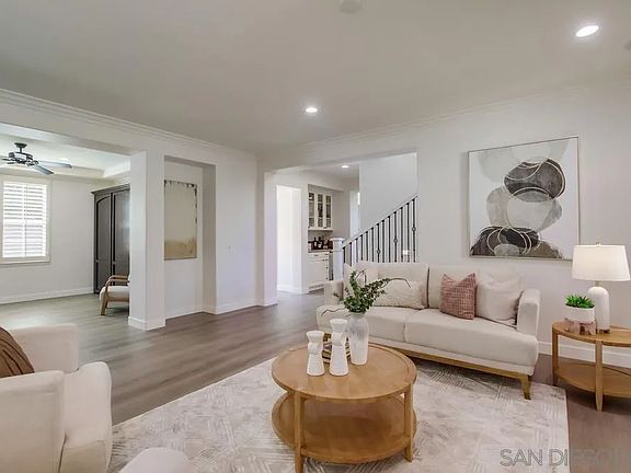 Prepare to be captivated by this stunning 3-bedroom, 2.5-bathroom home perched on a canyon in the heart of the vibrant La Costa Oaks community. With a sprawling 3,132 square feet of meticulously designed living space and a generous 6,231 square foot lot, this home invites you to explore its nuances and embrace its elegance. Step inside to discover an interior with new flooring and paint, setting a clean, welcoming tone throughout. The kitchen, a culinary artist’s dream, boasts newly refinished cabinets, a new Sub-Zero built-in refrigerator, designer appliances and wine fridge that perfectly complement the expansive layout. The primary bedroom, larger than most, not only offers a private retreat and balcony but also showcases west-facing views, providing a stunning display of colorful sunsets. All bedrooms are conveniently located upstairs, preserving the main floor for living and entertaining. Enjoy the cozy warmth and ambiance provided by two fireplaces—one graces the living room as you enter, and the other enhances the family room where the kitchen opens up, making it perfect for gatherings or tranquil evenings at home. An office space on the main level adds a practical touch for those who work from home or need a quiet study area. Further enhancing the home’s appeal is a whole-house water filtration system and a whole-house fan, ensuring optimal comfort and quality of living. This home artfully combines modern comfort with luxurious touches, inviting you to experience a lifestyle where every day feels like a retreat.null