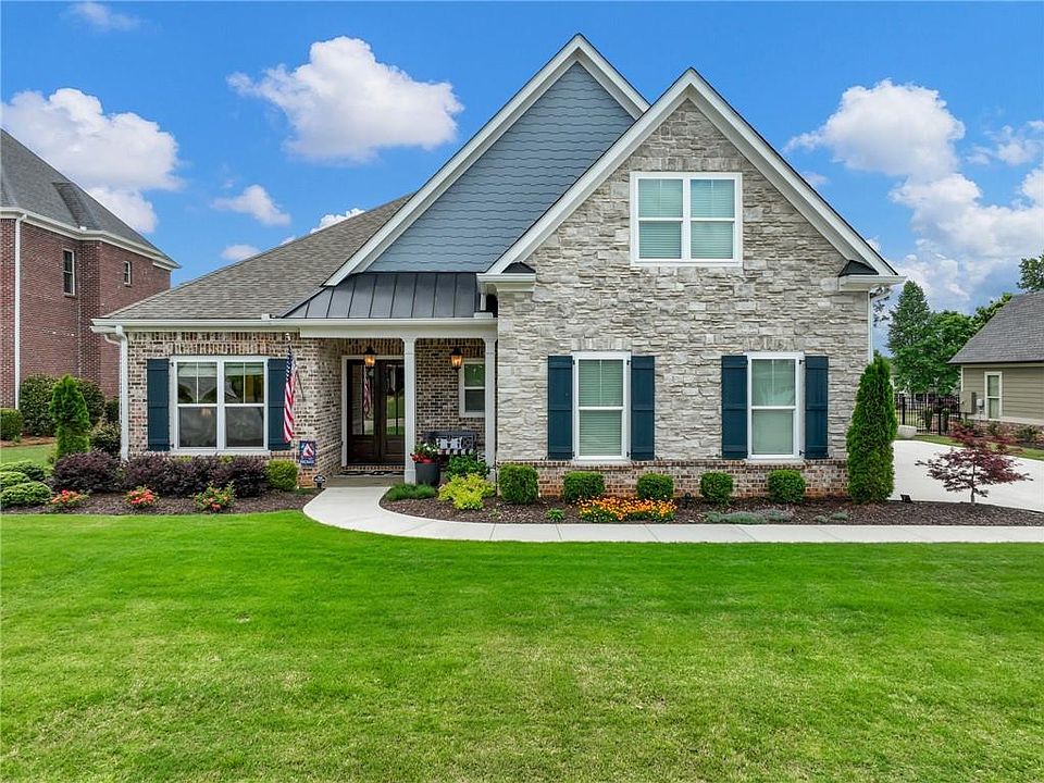 This lovely cottage-style home overlooks the 4th Fairway on Traditions Golf Course. As you step inside, the grandeur of the entrance foyer welcomes you, adorned with crown molding and illuminated by recessed lighting, leading the way to the expansive main living areas featuring soaring 10-foot ceilings. The interior showcases a meticulous blend of elegance and functionality, highlighted by the masterful craftsmanship of crown molding and allure of hardwood floors. The spacious great room with a fireplace offers a cozy retreat, seamlessly flowing into the separate dining room, perfect for hosting gatherings and entertaining guests. The heart of the home, the gourmet kitchen is a culinary enthusiast's dream, equipped with white cabinets, a breakfast bar, and a breakfast room overlooking the family room, creating an inviting space for casual dining and relaxation. Completing the main level is the luxurious master suite, featuring an oversized bedroom, a master bathroom with a double vanity and separate tub/shower, and a generous walk-in closet. Conveniently situated on the main level, accessibility is enhanced with safety features in both the entrance and kitchen areas, ensuring comfort and ease of movement for all residents. Outside, a private yard and a covered patio, offering the ideal setting for outdoor enjoyment and al fresco dining. The expansive lot, situated on a tranquil golf course, boasts manicured landscaping and ample space for outdoor activities. Additional features include a three-car garage, central heating and cooling with zoned control, and security features such as a fire alarm system, providing peace of mind and convenience. Impeccably maintained and thoughtfully designed, this home offers a rare opportunity to indulge in luxurious living amidst a captivating backdrop of natural beauty and modern amenities.