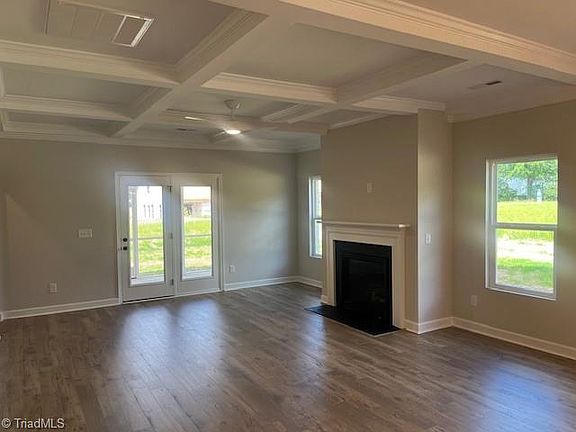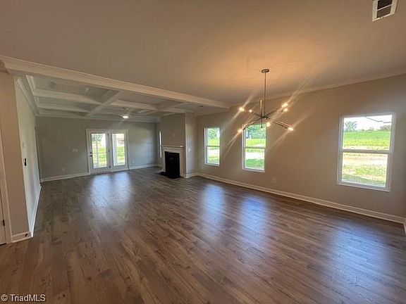 Gas log fireplaceGourmet kitchenLaminate hardwoodCoffered ceilingCrown moldingOpen floor planBeautiful finishes
