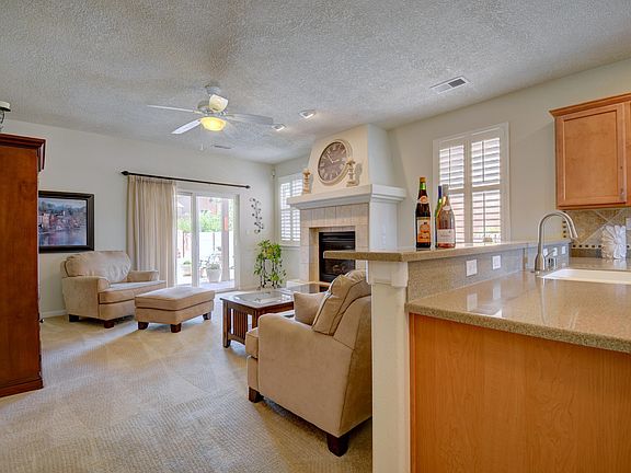 Immaculate one story Pulte home located in Lomas Encantadas! Nice open floor plan, this one owner home has been meticulously cared for and is ready for new owner. Large kitchen has solid Corian counters, decorative backsplash, lots of cabinet space, pantry, stainless appliances including 5 burner gas cooktop. Dining room has mountain views!! Plantation shutters throughout and Roman style blinds in primary! Serenity awaits you in the generous sized Primary bedroom with great separation from guest bedrooms. Primary also includes tray ceiling and large walk in closet. Ensuite with double sink vanity, garden tub and separate shower. Great room has gas log fireplace and sliding glass door leads you out to cover patio and lovely backyard.