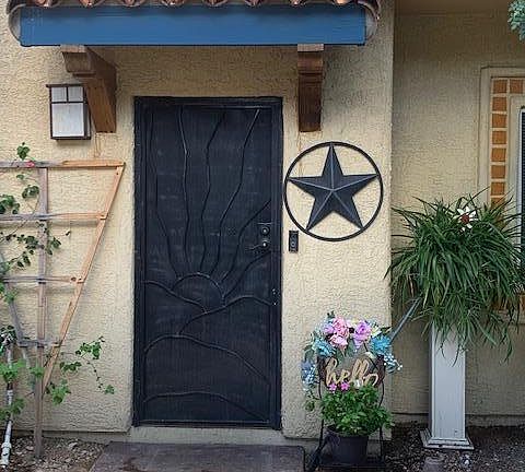 Sweet oasis in the desert. Lush courtyard greets all to this patio home. Covered parking for two cars directly in-front of home. Fully paid for solar panels on roof make this home very energetic efficient . Combination living/dining room, cute kitchen and powder room on main floor. Three bedrooms an two baths upstairs. Delightful balcony off the master bedroom. Master also features a large walk-in closet. Covered patio behind home leads to small yard. Enjoy behind back patio is a lushly planted area that affords privacy. Convenient to library and Kennedy park.