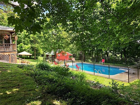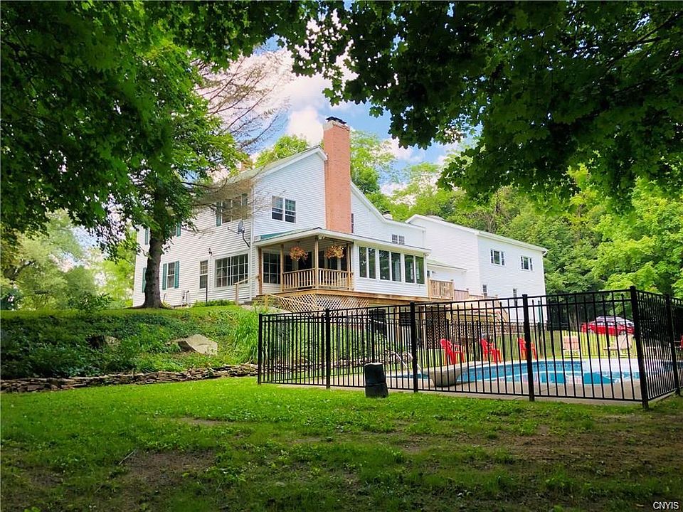 Peace and serenity overflow in this sweet & spacious country home. Completely updated w/modern amenities yet maintaining original details. Character & historic charm! Eat in kitchen w/wood stove & custom cabinets. Umbrecht LR w/gas FP natural light & built-ins! Formal DR w wood FP. New Windows through-out entire house! New baths, floors & fresh paint too! 6 large bedrooms, 4 full baths, study/playroom & extra large master. Lots of closets and storage. A taste of the Adirondacks in the heated 4 season "Adirondack room" overlooking the park-like yard, heated pool & 2 stall horse barn W/ water & electric! Awesome walk-out BSMT w/FP & 1/2 bath is calling to be finished. Unique property spans both sides of the street! EZ commute to Syracuse, Thru-way and shopping in Cazenovia schools!