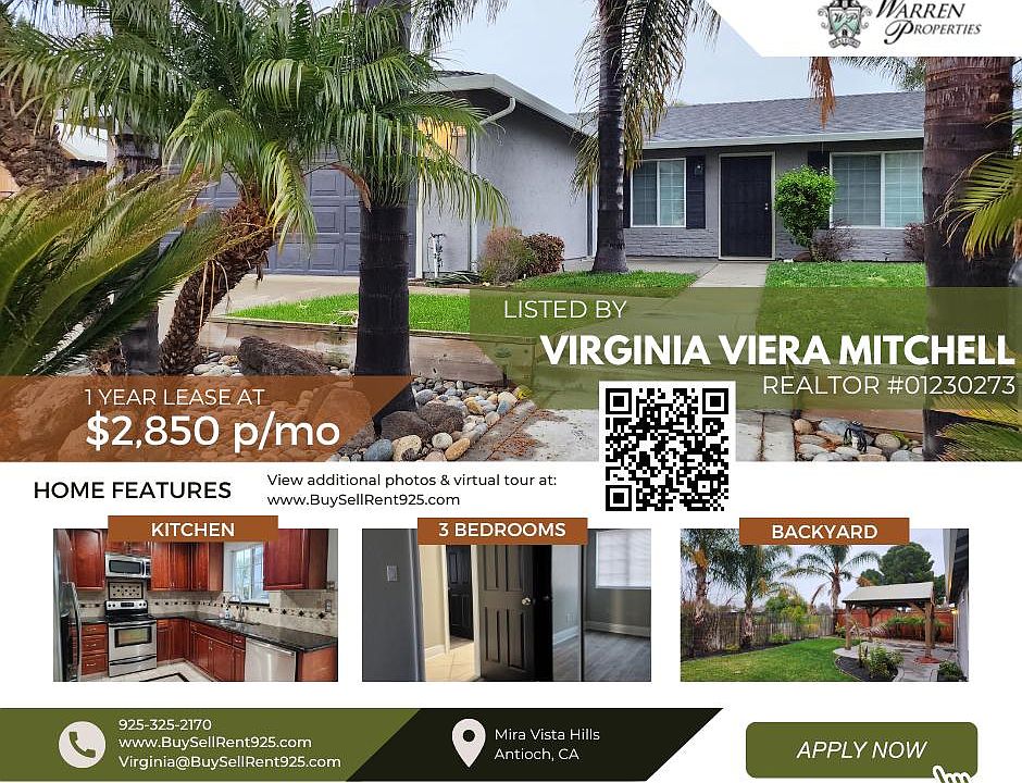 Stunning 3 bedroom home for lease nestled between two East Bay Regional Parks: Black Diamond Mines & Contra Loma, in Antioch's Mira Vista Hills. This home features tile floors throughout with dark grey engineered wood flooring in bedrooms. Kitchen window looks out to serene tropical backyard. Stainless steel appliances: refrigerator, electric range/oven, built-in microwave and dishwasher. Garage features laundry hook-ups and overhead storage. RV/Boat side-yard parking. Landscape maintenance included. Lease at $2,850 per month. Presented by: Virginia Viera Mitchell REALTOR & Real Estate Broker CA DRE License# 01230273 1 year lease. Landscape maintenance included in rent. Tenant pays all utilities & garbage. Application fee of $42 per person, includes credit report. Security Deposit and 1st month's rent due prior to occupancy. No smoking indoors or in garage.
