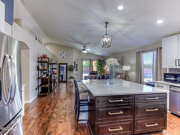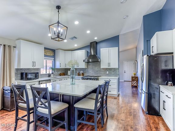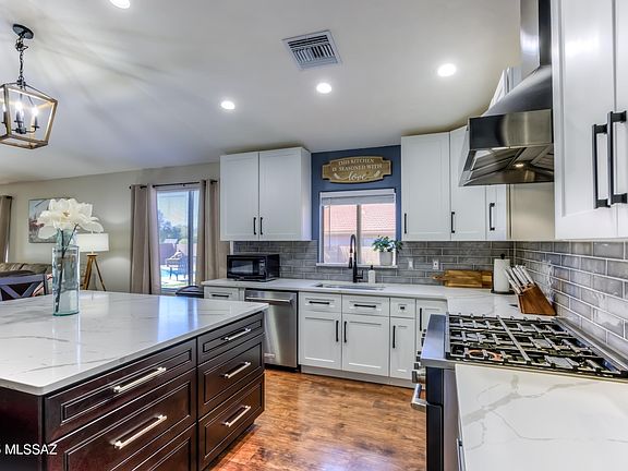 GORGEOUS HOME w/ GOURMET KITCHEN & POOL! Featuring GE Profile black stainless 36'' 6-burner range w/ hood, 42'' JNK cabinetry, tile backsplash, massive island w/ seating, & Premium Cal Quartz counters. On an oversized lot backing to a private wash w/ semi-Catalina views. MANY UPGRADES & NO CARPET, all laminate flooring, new bathroom vanities & solar screens. BACKYARD OASIS w/ POOL, TURF, flowerbeds, pavers, citrus trees, LOW care maintenance! Newer (6/2022) 17 SEER 2-stage HVAC PERFECT for a winter visitor, entertainer, family, w/ LUCRATIVE short-term rental potential. Seller prefers to sell furnishings w/ home on a separate bill of sale. OWNER/AGENT. Quick close available (TEP Solar Shares program transferable rate lock for an appx 8 years bill appx $220 per month!-Not solar panels).