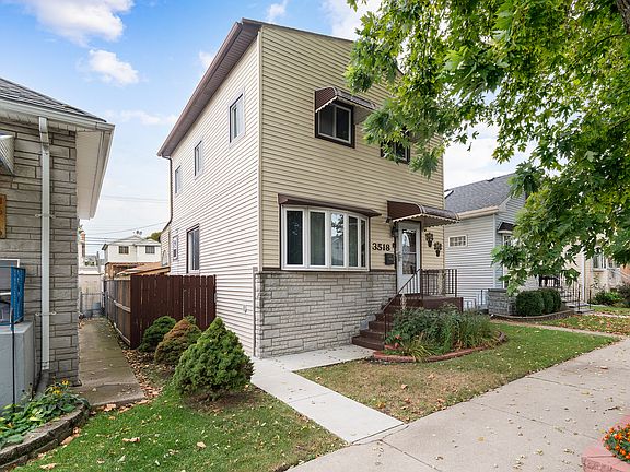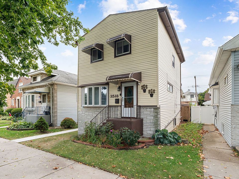 Charming Bungalow with Second-Floor Addition! The first floor offers a welcoming living room with a dining room, an updated kitchen with stainless steel appliances, and a convenient half bath. Upstairs, you'll find two comfortable bedrooms, a office space, and a full bathroom. The partially finished basement provides extra living or storage options. Step outside to enjoy a spacious yard with a large deck, perfect for entertaining, along with a two-car garage. Additional features include central air conditioning and gas-forced air heat. Located near local schools, public transportation, and just minutes from shops, restaurants, Hiawatha Park, Harlem Irving Plaza, and more-this home combines comfort with convenience in an ideal setting.