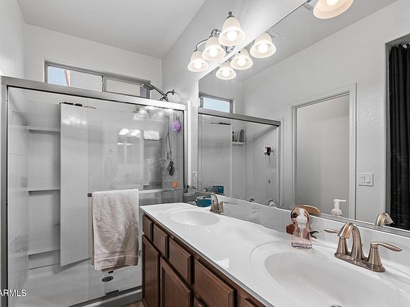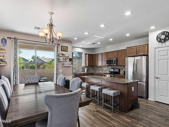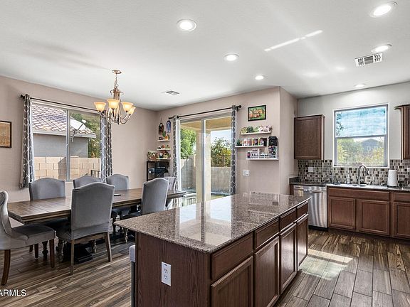 Functionality shines in the laundry room, which includes additional storage cabinets to keep everything neatly tucked away. Entertainment is effortless with a built-in surround sound system in the living room, while smart home living is elevated by Everlights, customizable app-controlled ''forever lights'' that add both flair and convenience year-round. Outdoors, the lifestyle continues with a covered patio extended by paversperfect for gatherings or quiet evenings. The backyard offers a clever balance of beauty and low maintenance, with a mix of turf, real grass in the dog run, and desert landscaping in the front.