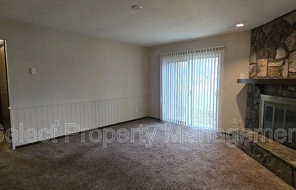 Step through the front door into a bright and spacious kitchen and dining area, complete with a stove, refrigerator, dishwasher, and plenty of cabinet storage. The adjoining living room features a charming brick fireplace and a sliding patio door that fills the space with natural light.