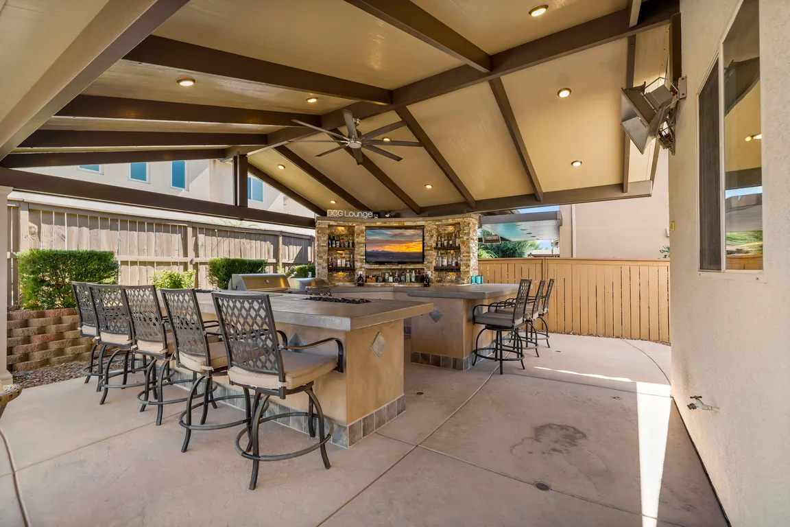 Sparkling poolWood-tone accentsSpa-like bathProfessional-grade barbecueRemodeled and lighted courtyardStone-accented facadeSpacious three-car garage