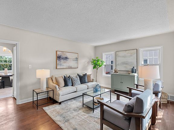 The kitchen boasts quartz countertops, stainless steel appliances, and generous cabinet space, while the dining area is perfect for gatherings. The living room showcases original hardwood floors, adding warmth and timeless charm.