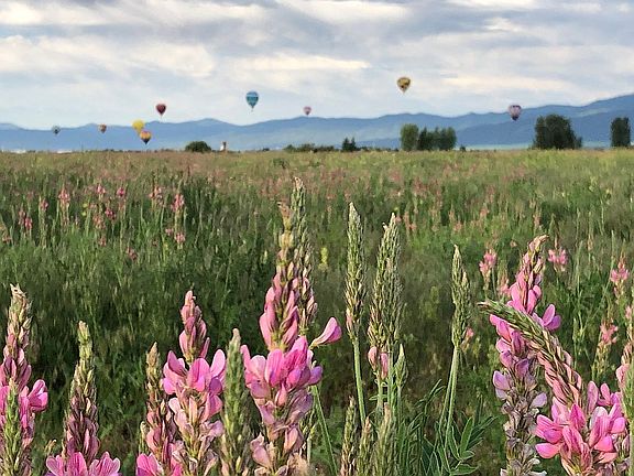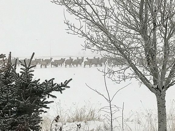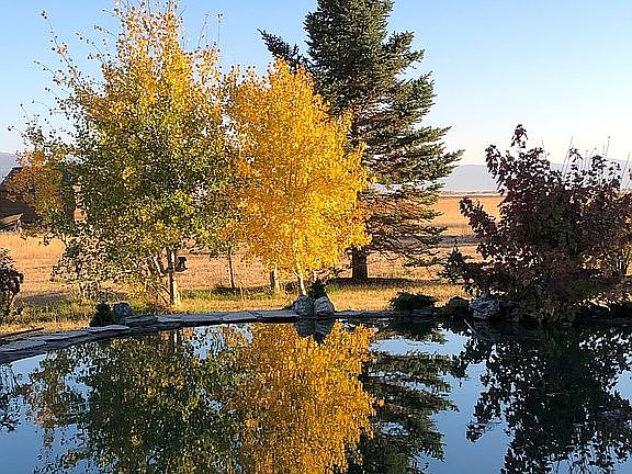 Teton view home in hot air balloon/elk corridor with mature trees, reflecting pool (pond), hot tub, flagstone patios, detached artist studio, canal running through property, etc.