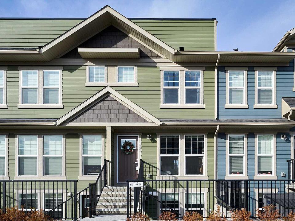 Welcome home! Discover this beautiful three-storey, 1,544 sq ft executive townhome located in the lower part of Cranston, within the sought-after Riverstone community. The site is perfectly positioned backing onto a large green space and very close to Fish Creek Park and the Bow River, this townhome offers a tranquil and scenic setting. The spacious main floor welcomes you with a large living room, an inviting dining area, and a massive kitchen counter island complete with a breakfast bar, while a convenient two-piece powder room is located just off the dining and living rooms. Enjoy the sunny west-exposed backyard, ideal for your puppy, family BBQs, and soaking up some extra sunshine. Upstairs, the second level offers two generous bedrooms—the primary easily accommodates a king-size suite and features a three-piece ensuite bath, and the second bedroom boasts east-facing windows, bathing the room in morning sunlight to help young ones rise early. The third level presents a versatile bonus space: use it as a music room, workout area, home office, guest quarters, or a quiet family room retreat, and step out onto the east-facing balcony for peaceful early-morning views. Throughout, neutral decor is complemented by quartz countertops, a breakfast bar, stainless steel appliances, central air conditioning for warmer days, and vinyl and carpet flooring; the entire home shows like new, with great windows offering abundant daylight. Your designated parking stall is just steps away from the front door. The Century Hall recreation facility nearby offers fantastic amenities including winter hockey and skating, a summer splash park, tennis courts, a summer skate park, meeting rooms, rental options, and a gymnasium. Additional neighborhood conveniences include access to schools, shopping, major traffic routes, and bike pathways, all with very affordable townhome fees—making this property a fantastic opportunity to join one of the best communities that southeast Calgary has to offer.