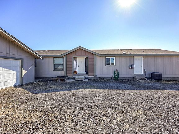 This charming 3-bedroom, 2-bath home is nestled off a quiet country lane on 1 acre, offering beautiful mountain & countryside views. The spacious, open layout features vaulted ceilings, oversized windows, & calming tones throughout, all set on engineered hardwood floors. The kitchen includes a large island, hard surface counters & pantry that flows to a spacious dining area—perfect for entertaining friends & family! A split floor plan has the main suite with a separate shower, soaking tub, & double sinks on one side, while 2 additional bedrooms share a full bath on the other. A double-door office could also serve as a 4th bedroom. The laundry room w/ storage completes the package. Outside, enjoy a covered back patio, fully fenced yard, & a separate fenced area with outbuildings for livestock. Extras are detached 2-car garage, RV hook-up & dump, a 288 sq. ft. studio/workshop with water & mini-split. Great well per seller, new solar panels system in 2023.