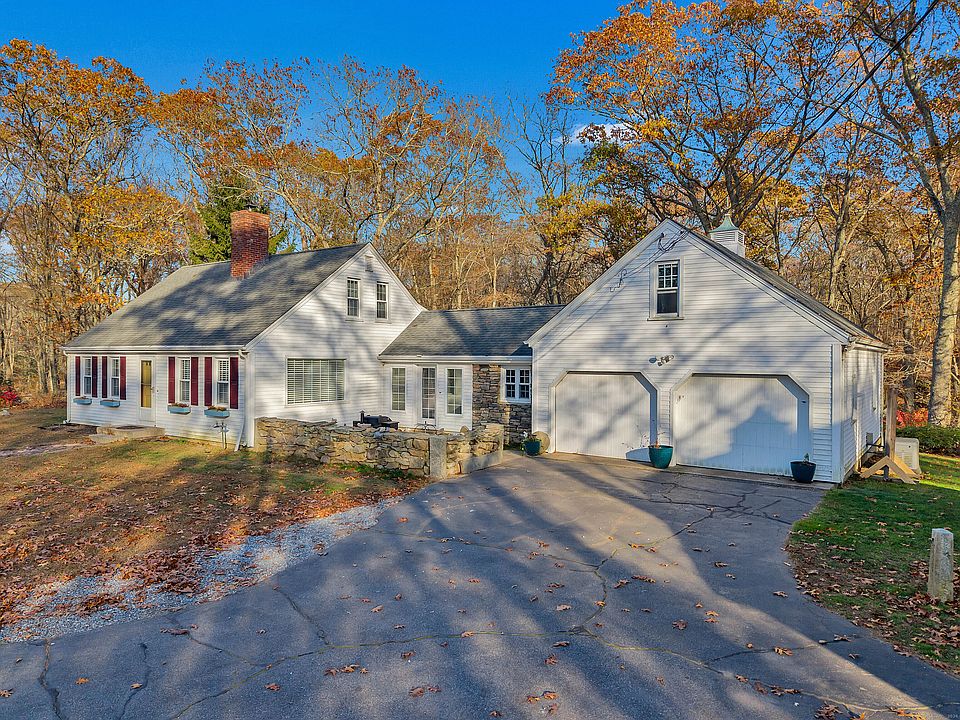 Exquisite 4-bedroom, 2-bath Cape Cod set on 2.60 secluded acres, offers a perfect balance of modern amenities and tranquil countryside living. The open floor plan creates a warm and inviting space, highlighted by an eat-in kitchen with white cabinetry, granite countertops, a small breakfast bar, and dining area. Adjacent to the kitchen, a breezeway connects the home to the front patio, complete with a charming stone wall, and opens also to the backyard patio, perfect for relaxing or entertaining. The main floor features two convenient bedrooms, one that includes the primary, and two additional bedrooms upstairs. The open living room has a fireplace and a large picture window that lets in plenty of natural light. Over the attached two-car garage is a finished heated room that provides additional living space and connects to an unfinished storage room, perfect for a potential in-law/caregiver apt. There's also a partially finished, heated attic with flooring, providing the potential for even more expansion or storage. Gorgeous hardwood floors and solid wood doors enhance the warmth and charm of this home. Additional features include radiant heat, a whole-house generator, laundry room, and storm doors, ensuring comfort and peace of mind. This property also includes a barn currently used as a workshop ideal for a home business, remote work, or space for hobbies. Whether you're looking for a peaceful retreat or a property with room to grow, this is a must-see.