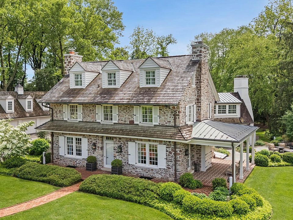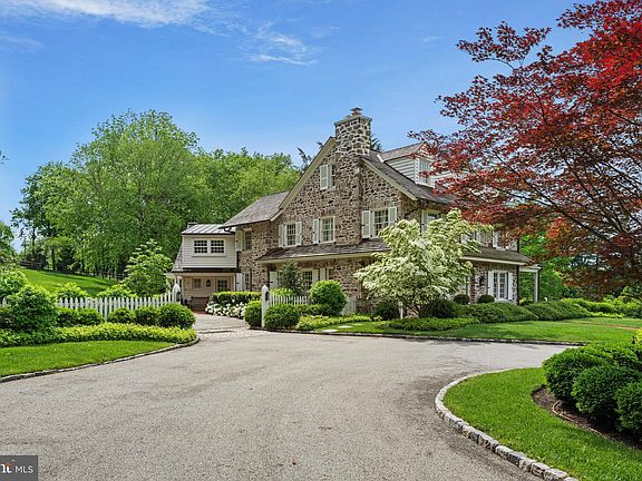 There are homes, and then there are homes that stand apart—352 Stenton Avenue is one of those rare treasures. Set at the end of a winding drive on a private, tree-shaded lot, this distinguished stone residence is a masterful blend of period craftsmanship and modern refinement. With roots dating back to the 1820s, the home has been expanded and reimagined over time, most recently through a thoughtful renovation by renowned local architect Warren Claytor. The result is a property that feels both timeless and utterly unique, where no detail has been overlooked and every element has been executed at the highest level. From handmade custom light fixtures by Heritage Metal Works and forged iron hardware by Michael Coldren to soapstone counters and sinks from Bucks County Soapstone, artisanal materials define the home at every turn. Wide-plank reclaimed oak floors, arched doorways, wainscoting, and intricate millwork set a tone of understated elegance. The gracious center hall opens to the formal dining room, anchored by a fireplace and adorned with a hand-painted mural depicting Valley Forge and the Delaware River. Built-in glass-front cabinetry enhances the space with both beauty and utility. Opposite, the living room invites gatherings with its broad bay window, fireplace, and French doors that lead to a covered porch overlooking the grounds. At the heart of the home, the kitchen is a showcase of craftsmanship and functionality. A Lacanche range with brick backsplash, custom cabinetry, honed soapstone island, reclaimed wood beams, and hand-forged iron hardware create a space that is both artisanal and practical. The adjoining dining area, complete with reclaimed-wood wet bar and access to the patio, is ideal for casual meals or al fresco entertaining. A sunlit family room with dramatic stone hearth and wood-beamed ceiling, along with a powder room and mudroom/family entrance, complete the main level. Upstairs, the primary suite is a private retreat with gas fireplace, custom built-ins, walk-in closet, and a marble-clad bath with double vanity and walk-in shower. A secondary suite with its own bath is tuck off the hall. The second floor also offers a laundry room with dual washer/dryers and soapstone sink, a light-filled office, and a third bedroom or sitting room with reclaimed wood mantel over the fireplace. The third floor includes two additional bedrooms and a full bath hall bath. The partially finished lower level offers flexible living with a rec room, powder room, and ample storage. A detached three-car garage includes a large finished second floor with full bath, one bedroom and large great room, perfect for guests, a home office, or independent living. Outdoors, the grounds are as carefully considered as the interiors. Multiple terraces and porches embrace the gardens: a slate patio with outdoor stone fireplace overlooks the sweeping lawn, a covered porch extends from the living room, and a more secluded patio lies off the family room. Mature trees and perennial plantings ensure year-round beauty and privacy. Perfectly situated, 352 Stenton Avenue offers serene living with unmatched convenience—just minutes from major commuter routes, Chestnut Hill’s boutiques and dining, and near-by amenities in Plymouth Meeting and Ambler.