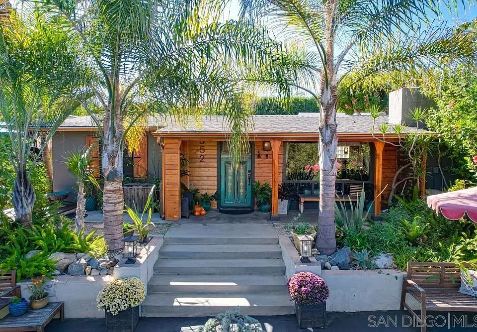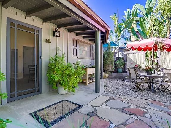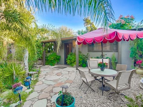 Welcome to your serene mid-century modern retreat in the heart of Fallbrook! This charming single-story home offers 3 bedrooms, 2 bathrooms, and 1,943 sq. ft. of living space, situated on a spacious 0.65-acre lot of flat, usable land, plus an additional 1 bed, 1 bath detached guest house/ADU—ideal for rental income or multi-generational living. Step inside to find a cozy living room with stunning wood ceilings and a classic brick fireplace. The kitchen is equipped with stainless steel appliances and granite countertops, while the additional family room boasts new porcelain floors, a gas fireplace, and easy access to the primary ensuite. The newly updated primary bathroom features a dual-sink vanity and an expansive shower. Step outdoors and discover a private paradise with endless features! Enjoy a hobby farm with secure animal pens, an orchard with assorted stone fruits, citrus, apple, mulberry, dragon fruit, and bananas, and lush landscaping with mature trees, tropical patios, custom palapas, and vibrant flowering plants. Relax by the Koi pond, unwind in the hot tub on the large deck, or entertain friends at the built-in BBQ and bar. Multiple patios with covers and sitting areas offer a perfect blend of sun and shade. With ample open space, this property offers excellent potential for a detached garage, workshop, second guest house/ADU, pool or even a horse corral. Additional features include a new roof on both the main house and guest house, a solar system and storage shed.