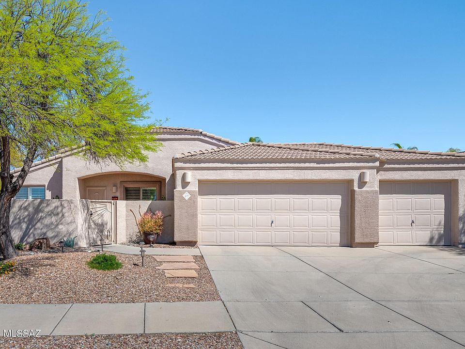 Located on prime corner lot within Monterra Ridge, this charming 1,686sf 3BR/2BA single-story residence in Oro Valley is the epitome of home sweet home. Step into the inviting front courtyard w/privacy wall, setting the stage for the many custom upgrades found throughout this home. Highlights include iron security screen door, upgraded kitchen cabinets, new appliances (2022), breakfast bar, plantation shutters, ceiling fans & vaulted ceiling. Primary suite has walk-in closet & ceramic tile shower w/decorative stone band. Backyard oasis is a private retreat, featuring a covered patio, newly replastered Pebble Tec pool w/waterfall, colored concrete patio finished w/faux flagstone & Kiva fireplace w/banco seating. (see More...) Bonus room in garage is complete w/window, plantation shutters, ceiling fan & mini-split air conditioner/heater. 2 car garage w/storage space. New HVAC (2021). Conveniently located near shopping, dining, library, Oro Valley Community Center w/fitness center, golf courses, pickleball & tennis courts, as well as Naranja Park offering hiking trails, dog park, ramadas, birding trails and newly-renovated to include skate park, splash pad, pickleball courts & multi-use fields.