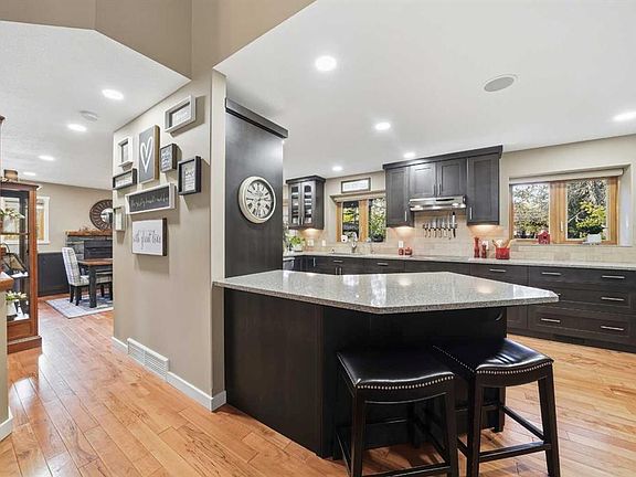 Gorgeous kitchenAlder cabinetsQuartz countertopsEating barGas fireplaceCustom bookshelvesCovered deck