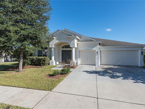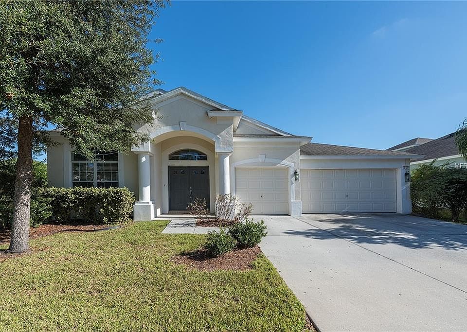 Absolutely gorgeous 4/3/3 in Meadow Pointe at 2729 square feet for under 300K! This beautiful, one story home features a formal dining/living right off the entry with 12 foot ceilings and tile floors for easy maintenance. In the kitchen, you will find solid surface counters, solid wood cabinets, stainless appliances, and a built in desk for extra storage. The floor plan offers a 3-way split for maximum privacy. The master features double master vanity, garden tub plus separate shower stall and water closet and massive walk-in closet. kitchen/family room combo that overlooks the over sized covered lanai are great for entertaining. All positioned on a large corner lot over 1/4 arce. Plenty of storage in your 3 car garage. You will enjoy sitting on your covered lanai in this fabulous gated community with access to all the Meadow Pointe amenities. Recent upgrades include new A/C (2017), new roof 2018, new water heater (2017). Call today for your private showing.