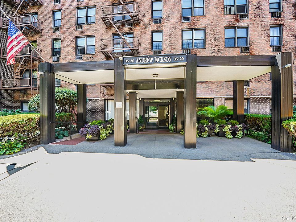 Welcome to the Andrew Jackson Condominium, a well-maintained elevator building in the heart of vibrant Jackson Heights. This spacious unit features a beautifully updated kitchen with elegant countertops, stainless steel appliances, and ample cabinet space. The open-concept living and dining area boasts refinished hardwood floors and a smart, functional layout. Step out onto your private patio and enjoy a peaceful morning or evening breeze with open-sky views. Additional highlights include generous closet space and a sleek, modern bathroom with tasteful tile finishes. Amenities include a laundry room, outdoor swimming pool, recreation room, 24-hour doorman, and an intercom system for added convenience and security.