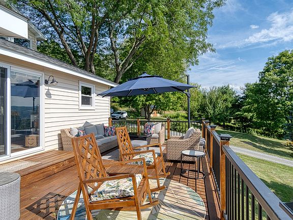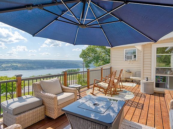 VIEWS VIEWS VIEWS from almost every room! This charming home has many updates including new kitchen with quartz countertops, farmhouse sink, and SS appliances. New LVP continuous flooring throughout first floor, new patio door, and fabulous front deck overlooking Seneca Lake where you'll most likely spend the remainder of your summer. The updated entryway with second floor flex room above has all 4 sides of windows and could be an art studio, writing room, office, workout room, bedroom; the options are endless. Master suite, another bedroom and full bathroom on first floor. Partial finished basement being used as a bedroom with a sunroom. The stone patio with mature shade trees and landscaping is almost zen-like. The detached one-car garage has plenty of space for storage/workshop and an additional new shed gives another "room" to be used as you wish. Fenced area for dog run. New furnace as well. Close to several state parks, wineries, breweries, farmer's markets, & racetrack.
