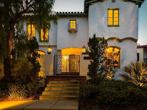 Graceful, light-filled Spanish home with beautiful character details and delightful modern upgrades. Elegant curb appeal, hillside views, privacy. Romantic entry with sweeping staircase leads to a sophisticated, spacious living room with a large-scale picture window and handsome fireplace, flanked by glass doors that open to a Tuscan-style courtyard perfect for summer evening gatherings. Formal dining room and break room/office flow into an expansive modern chef's kitchen and informal living area with decorative fireplace, also open to the courtyard. Upstairs, an airy Master suite with decorative fireplace and charming bath; two roomy bedrooms with Jack-and-Jill bath, and a tucked-away den with decorative fireplace. Character wood windows and lovely peg and groove floors thruout. Adorable hide-away guest house. Huge garage with lots of possibilities. Grassy yard, garden, and separate play area.