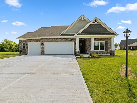 Check out this beautiful Craftsman style ranch in New Palestine's popular Sunrise Lake by Bridgenorth Homes. You'll notice the quality in the details from the moment you walk in as you are greeted by the arched entry/walkway, custom columns, and step ceiling. As you move into the great room/kitchen area you will find soft close cabinets, granite counters, subway tile backsplash, gas range, large pantry, and luxury vinyl plank flooring. Thoughtfully designed, you will notice the laundry room right off the primary bedroom closet, a stunning tiled shower with bench seat in the primary bathroom and a covered patio and extra concrete pad for more entertaining space. The features in this home will not disappoint! Check it out today!