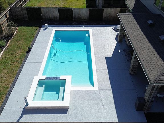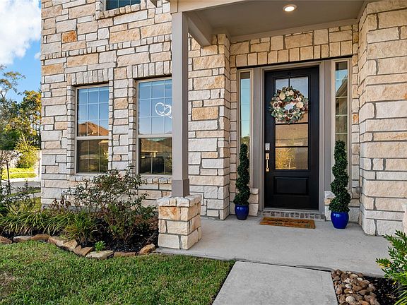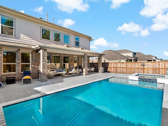 This tranquil and spacious home offers a quiet retreat, complete with a backyard that feels like a private vacation destination. The serene environment provides a perfect escape, featuring spacious living areas & an outdoor space that will make you feel like you're on a permanent getaway. Luxuriate in a contemporary saltwater pool with an attached hot tub. This home sits on a corner lot with woods lining the backyard for added privacy. There is even a side street to accommodate guest parking. This immaculate property is perfect for entertaining or relaxing. The beautiful Kitchen connects to the formal dining & open to a living room filled with natural light. Energy-saving features like double-paned windows with specialty blinds throughout for your peace of mind. This home has never flooded & is conveniently located near 59, HEB, Starbucks, &various restaurants. Enjoy access to miles of nature trails. Ideal for those seeking a pristine home with modern amenities & a peaceful setting.