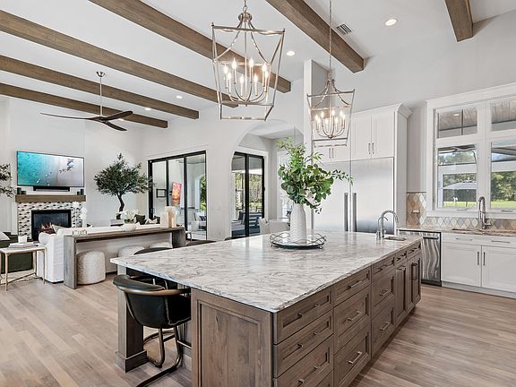 Private poolGrand fireplaceHot tubSpacious bedroomsCustom home office spaceSophisticated island kitchenStunning golf course views