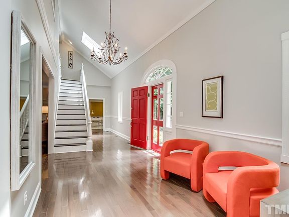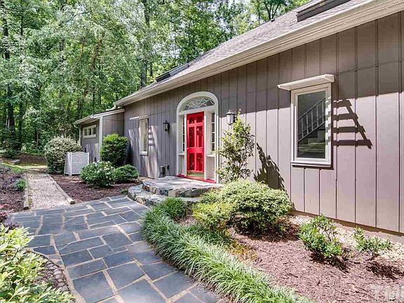 Unique 4 Bedroom 5.5 bath contemporary on large 2ac lot in fantastic location! Close to Durham Academy yet set back in the woods, upscale home with lots of outdoor AND indoor living space! 1st floor master suite! Large open floor plan with interesting spaces and huge windows providing VIEWS and lots of natural light. Wood floors, kitchen with granite. Bedrooms are large with their own baths. Spacious finished basement with full bath. Convenient to Duke, UNC and downtown! Detached wired workshop. WOW!