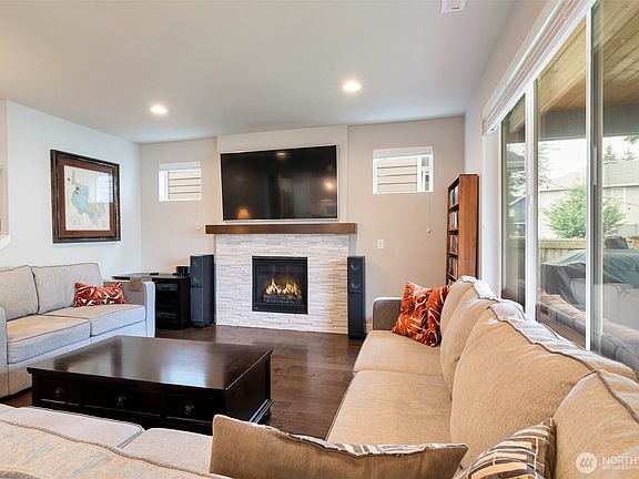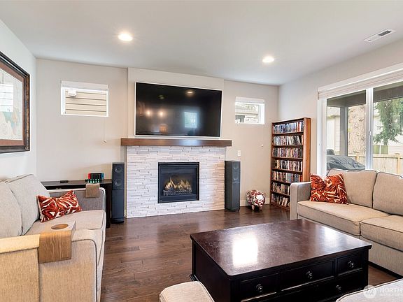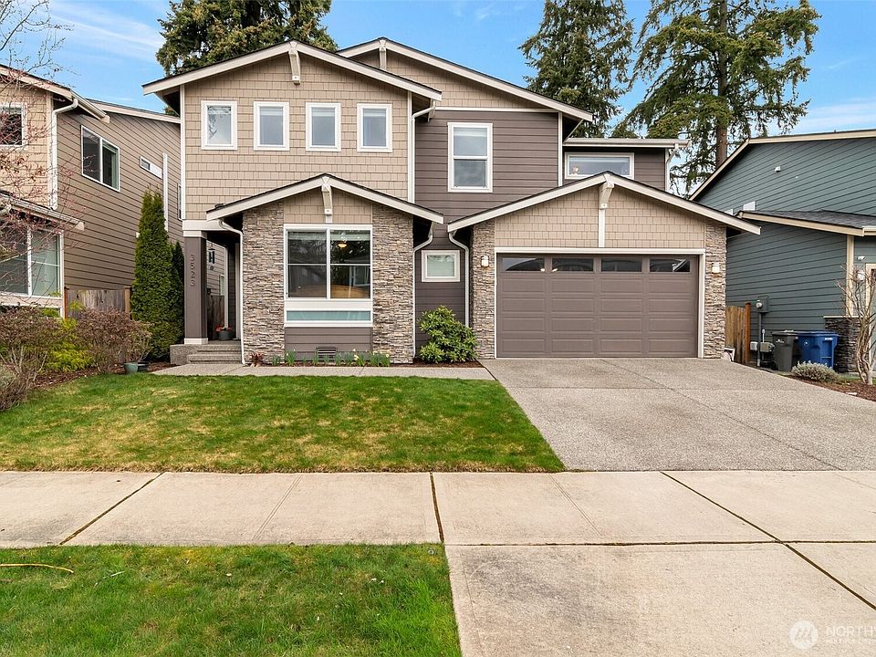 Light & Bright Woodland Trail craftsman in the heart of Mill Creek on quiet street. Inviting entry, high ceilings, craftsman touches & open floor plan with rich plank hardwood flooring. Main floor bedroom with ¾ bath. Gourmet kitchen with Shaker cabinetry, quartz counters, stainless appliances, pantry & prep island open to dining & living area with cozy gas fireplace & access to private, covered back patio & fenced, level yard. Mud room with built-in bench. Upper floor large open loft flex area, Primary Suite with walk in closet & 5-piece bath, two additional bedrooms, full-bath & laundry with storage. Two car garage & plenty of off-street parking. Community park/playground. Easy access to conveniences, trails & award-winning schools. A/C!