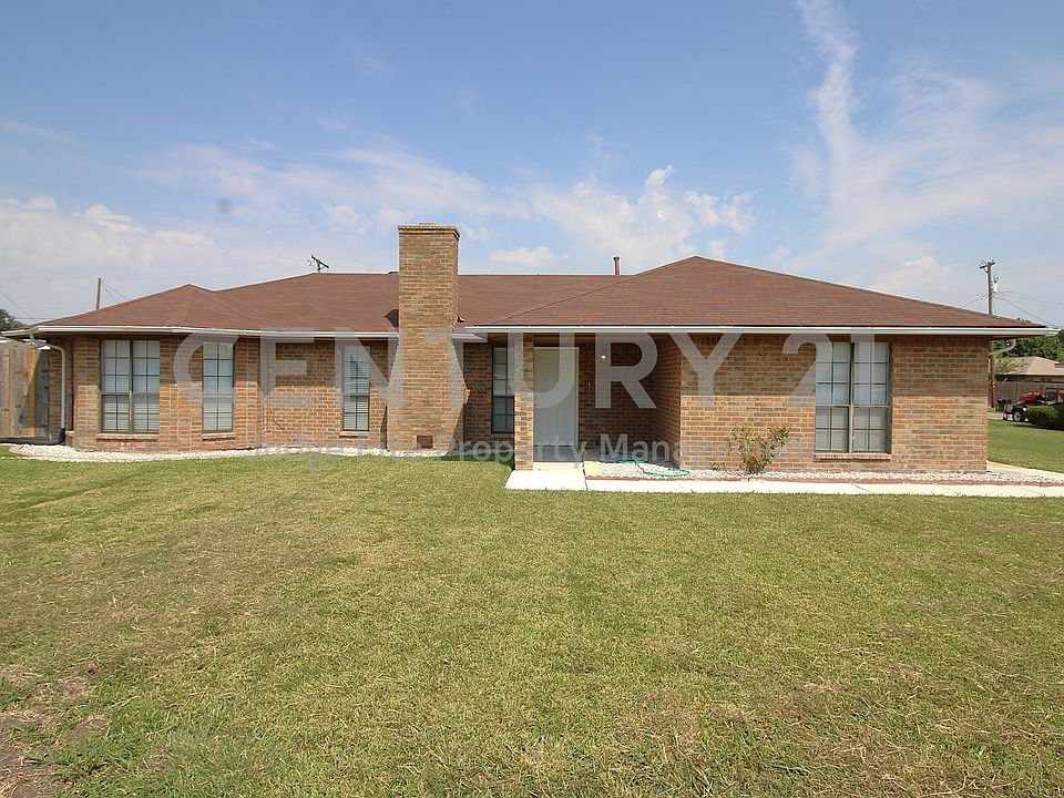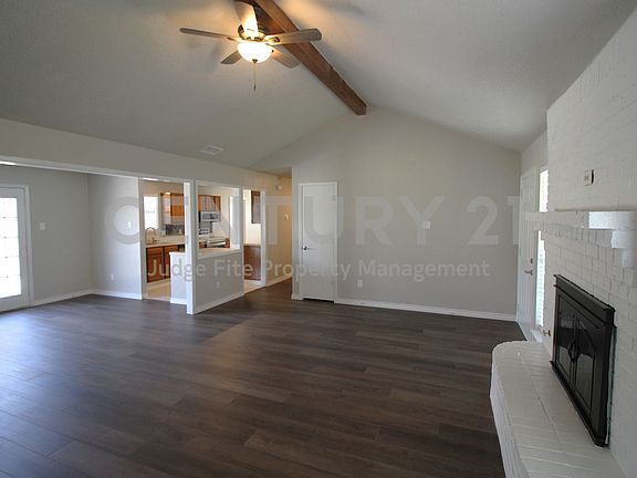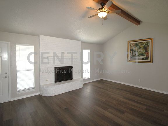 Step into this beautiful 3/2/2 home where style meets comfortable living. The house features a spacious kitchen with an electric range, built-in microwave, and dishwasher, all surrounded by sleek tile floors and ample cabinet space. The adjoining living room boasts a rustic wood beamed vaulted ceiling, a cozy brick fireplace, and wood-look flooring that extends through the hallway and all bedrooms. The primary bedroom offers a tranquil retreat with its own bay window and an en-suite bathroom featuring dual sinks and a walk-in closet. Two additional bedrooms provide plenty of space for family, guests, or a home office. Outside, you'll find a large, fully fenced backyard with a patio area, great for entertaining or relaxing. There's also a storage shed for your tools and equipment. This home seamlessly blends practicality and style, making it an ideal place to live. No pets please.