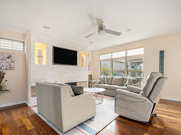 Cozy fireplaceAttached two-car garageMain-level primary suiteWalk-in tile showerMain-floor laundrySoaring ceilingsNatural light