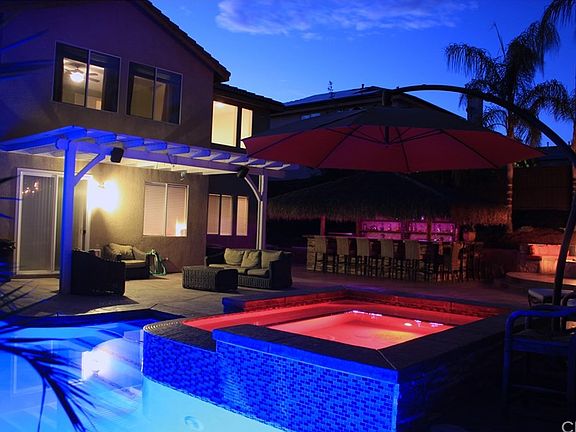 Welcome home to this beautiful entertaining home located in Wildomar Ca, right on the border of Wildomar and Murrieta. This large home features an immaculately upgraded back yard which includes an 11'x32' fresh water pool with an 8'x10' spa along with a built in gas fire pit with seating for the whole family and a 22'x18' palapa with built in sink, BBQ area and attachments for a kegerator. The first floor opens into a large family room with plenty of natural lighting and a 20+/-' ceilings and features travertine flooring and baseboards throughout the first floor. The first floor also features a large kitchen with a center island, a large living room and a single bedroom with a full bath. The second floor features 4 bedrooms, including the master bedroom, 3 of which have walk in closets, and a full laundry room with storage and sink. The master suite features a his and her vanity with his and hers walk in closets. Each bedroom also features ceiling fans, dual pane windows and an added whole house fan to help with cooling and keeping your electric costs down. This home has plenty of parking for the whole family with 3 driveway spots and an attached 3 car garage with plenty of storage and two work benches. Located minutes from the 15 and 215 freeways and very close to shopping, restaurants, and schools makes this the ideal location for the family looking for a great entertaining home with plenty of room.