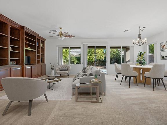 This most popular St Croix model is loaded with curb appeal and is an interior location in the newer section of SCPD. Stamped concrete both on the walkway and the gated courtyard welcomes owners and guests in. With 2 BRs/2BA, den and hobby room, a very large great room and kitchen it's easy to see why this plan is always most in demand. Built-in bookcases in den. Also built-in entertainment center in great room. Primary bedroom is very large and can handle large furniture. Custom built-ins in primary closet. Interior and garage was just freshly painted. Ceiling fans in all traffic areas. Corian countertops with an extension is great for home chef. Backyard has mature landscaping and multiple fruit trees. All furnishings are virtually staged and not available for sale.