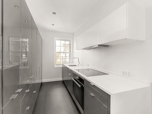At the other end of the foyer, you'll find a modern, eat-in kitchen. It’s equipped with top-of-the-line appliances, including a Miele dishwasher, Miele cooktop stove, and a double-width Liebherr refrigerator/freezer. The kitchen features slate floor tiles, gleaming gray lacquered cabinetry, a north-facing window, and plenty of space for comfortable dining.