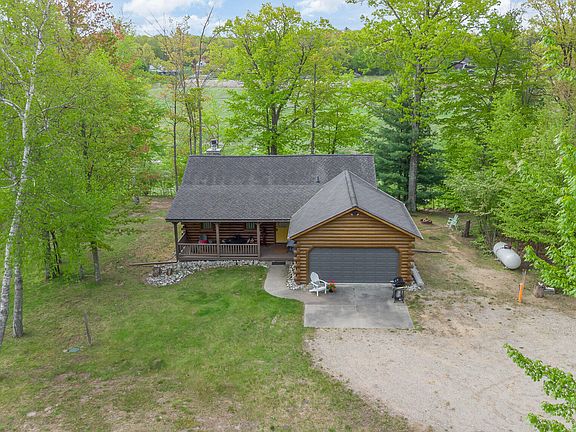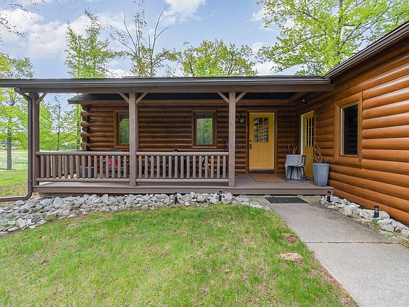 Welcome to English Point, a stunning retreat nestled on a picturesque peninsula. This exceptional 1.26-acre property offers a rare combination of privacy and tranquility, enhanced by 204 feet of beautiful Wixom Lake frontage. At the heart of this peaceful setting is a custom-built log home that captures the essence of up north living. The home features 1,200 square feet on the main level, complemented by an additional 600 square feet of finished space in the walk-out lower level. An attached garage provides convenience, while a detached 32x40 outbuilding—constructed in 2022—adds incredible versatility. This newer building includes concrete floors, electricity, and a finished upper level that serves as bonus living space. As you enter the property from a private road, a long driveway leads you to the welcoming covered front porchan ideal spot to relax and take in the natural surroundings. Inside, you'll find gleaming wood floors and a warm interior of log and knotty pine walls. The open-concept kitchen and living area features vaulted ceilings with exposed log beams, a wood-burning fireplace with a fieldstone surround and custom mantle, and large windows offering serene lake views. A sliding glass door opens to an expansive lakeside deck, perfect for entertaining or simply enjoying the scenery. The kitchen is fully equipped with all major appliances and includes an eat-in dining area along with a second slider to the deck. The primary bedroom features a private half bath, while two additional bedrooms and a full bath complete the main level. Downstairs, the spacious family room provides a cozy gathering space and doubles as overflow sleeping quarters, perfect for visiting children or grandchildren. This home is being offered fully furnished with items thoughtfully chosen to complement the style and comfort of the property. Additional features include a Generac generator, whole house water filtration system, central air conditioning, Spectrum Internet, and a dockmaking it move-in ready and equipped for year-round enjoyment.