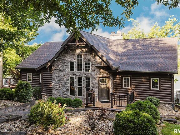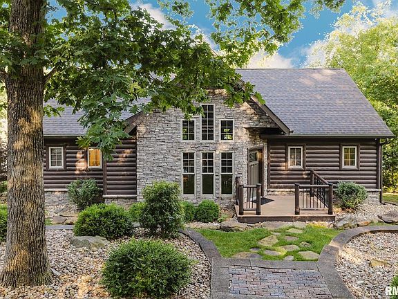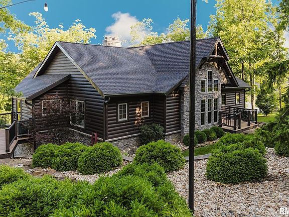 2.65 acre Log home estate on Lake of Egypt with stunning waterfront views and deep water access. Meticulous landscaping and paver circle drive welcome you home. Inside, enjoy luxury with rustic charm, wood beams and staircase from Michigan, and a stone fireplace. The kitchen and dining overlook the lake and feature a walk-in pantry/coffee bar. The main level offers two primary suites with hardwood floors and access to the covered composite deck with new railings and a stone outdoor fireplace. The lower level includes a family room where you can saddle up to the bar to enjoy a beverage. The additional three bedrooms are located downstairs, 2 with an attached shared bath and another full bath for guests right outside the other bedroom. Outside you will enjoy the covered and uncovered paver patios. Walk down natural stone steps or take the golf cart path to the water where you'll find a double covered dock with one boat lift, two PWC lifts, and a swim platform. Relax at the lakeside bar, engage in a game of cornhole, or gather around the fire pit for evenings by the water. Paver paths and natural stone accents add to the beauty and function of this lakefront retreat. This property offers the perfect blend of lake living, entertaining, and peaceful relaxation. This incredible home is being sold furnished and includes a new roof, gutters, soffit, garage doors, composite decking and railing around upper back deck. Detached garage.