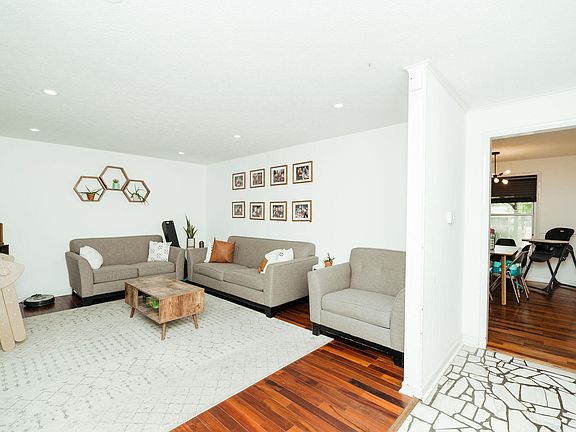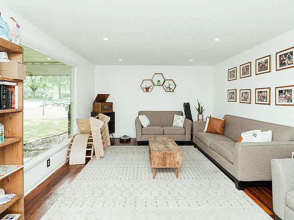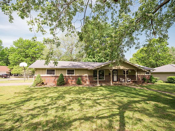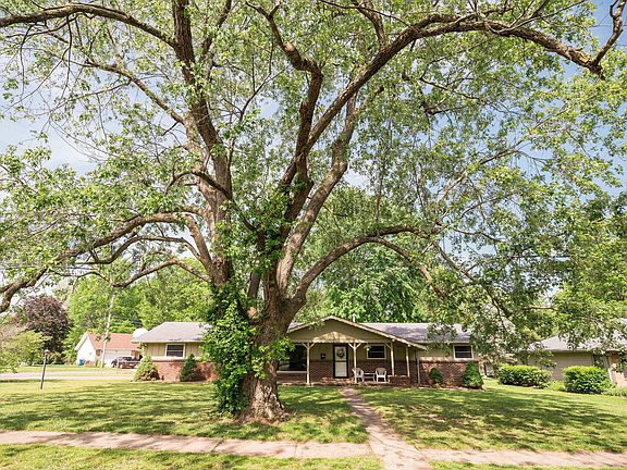 This ranch-style home has neutral colors and vintage charm to create a warm and inviting atmosphere. The covered front patio has a scallop edge trim fascia, solid wood posts, and a raised brick garden bed that adds to its curb appeal. As you step inside the house, you are greeted by white stone tile floors in the entryway that seamlessly transition to narrow plank Brazilian hardwood flooring throughout the house. The first living room to the left has recessed lighting and an oversized window. Straight ahead is the formal dining room with a pendant light, large window, and the entry to the kitchen.The kitchen features trayed ceilings, beautiful white cabinets that maintain a vintage charm, and contrasting hardware that adds to its appeal. The vintage bullnose trim countertops set below the white tile backsplash is paired with stylish butcher block countertops against the adjacent wall to create a lovely balance. The kitchen flows seamlessly to a spacious 2nd living room with a floor-to-ceiling brick fireplace and large windows. Sliding glass doors open up to a covered patio overlooking the fenced-in backyard shaded by large mature trees. Just off the 2nd living room is another hallway with mosaic-tiled floors leading to a 2nd full bathroom with a walk-in marble-tiled shower and mosaic accents. Down the hallway are washer and dryer hookups below built-in cabinets and a second exit leading to the backyard. The three bedrooms and large full bathroom are tucked in the hallway off of the entryway. The master bedroom has a walk-in closet with a private door to the shared bathroom with double vanities, granite countertops, and a large soaking tub with pebble-tiled walls. The covered slate patio overlooks the spacious fenced-in corner lot with mature trees, making the backyard a great place to relax and entertain. The home is located in a highly sought-after neighborhood with fantastic schools and a short drive to Springfield's many amenities. New roof to be installed!